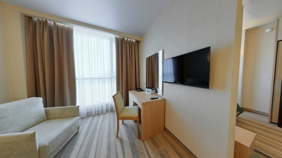 Оснащение номера: две односпальной кровати, кресло-кровать, фригобар, телевизор, сейф, фен, набор посуды: 2 стакана, ваза для фруктов, поднос, wi-fi